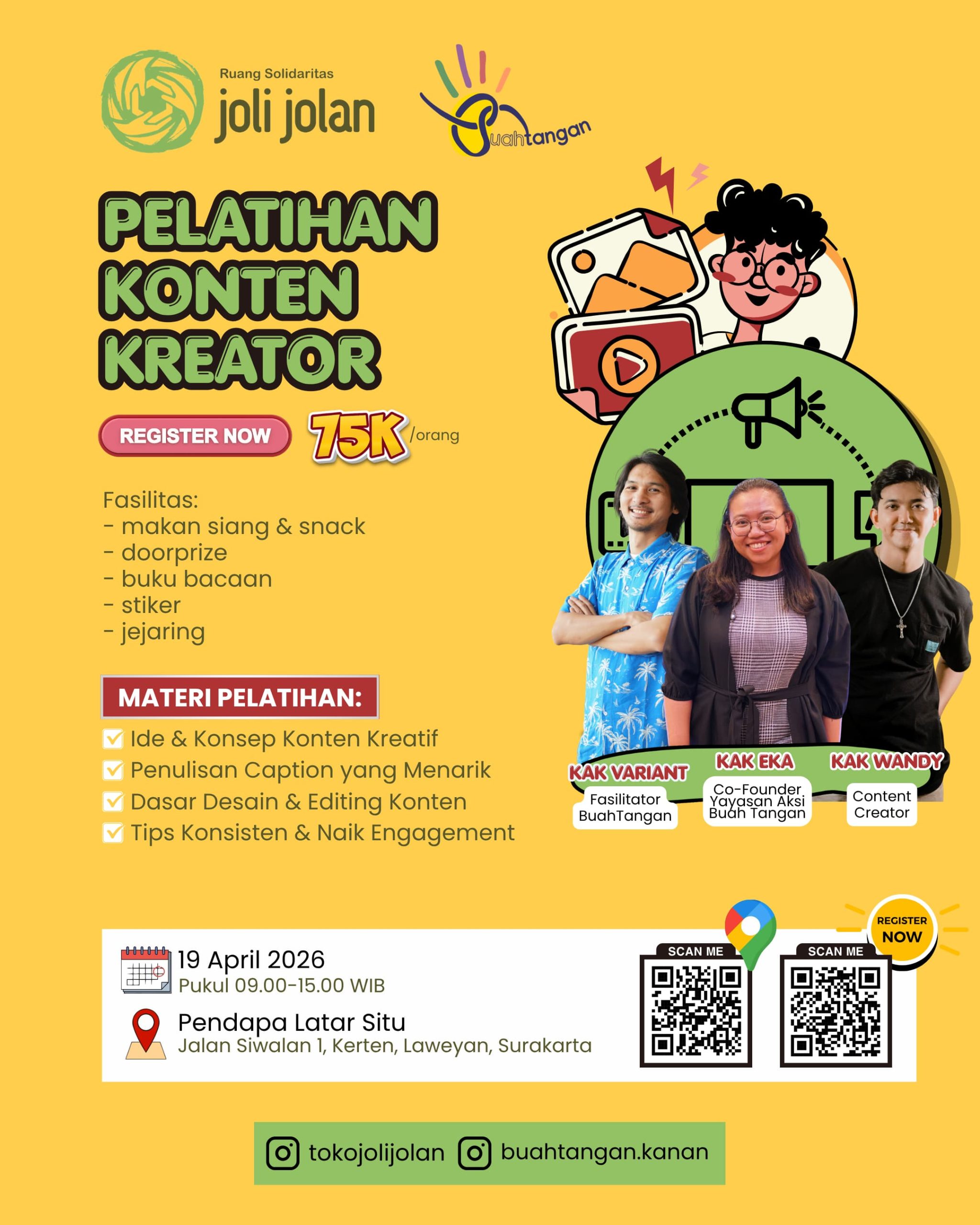 Mau belajar jadi konten kreator atau meningkatkan kemampuan ngonten? Expert dari BuahTangan berkolaborasi dengan Joli Jolan membuka kesempatan sharing skill mengelola media sosial.